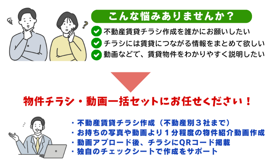 途中、金額の修正もすぐ行なってくれ、動画、チラシ共に評判がよく、賃貸へつながることができました。
